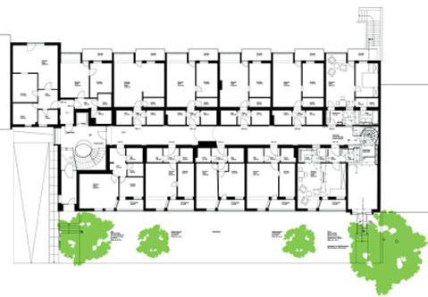 Das bestehende Wohnhaus aus den 50er Jahren wird in mehreren Bauabschnitten komplett saniert; die Grundrisse der sechzig Wohnungen werden umstrukturiert und neu zoniert. Die Mieter können hierfür in die bereits fertiggestellten Wohnungen wechseln. Im ersten Bauabschnitt wird zudem ein neues Fluchttreppenhaus erstellt. |
