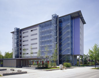 Ansicht von Osten Als hohe flache Scheibe markiert der Bau die ortsrandähnliche Situation zum Feldmochinger Anger. Eine Mischung aus Laubengang- erschließung und Dreispännern erlaubt vielfältige Wohnungstypen Die Gliederung des Baukörpers übernehmen die Treppenhäuser und Aufzugstürme, das Dach bindet die Baumasse zusammen. < 1 2 3 4 5 > |